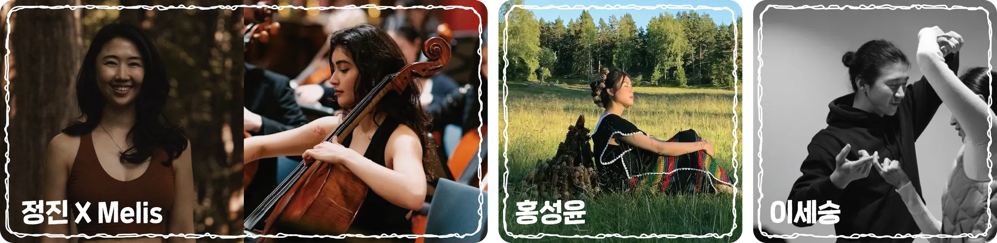 예술과 함께하는 명상의 세계로 초대합니다. 초보자도 참여할 수 있게 친절한 가이드와 함께 진행될 예정이에요. 정진 X Melis부터 홍성윤, 이세승까지. 총 3개의 프로그램을 운영하니 가장 참여하고 싶은 프로그램을 신청해 보세요!